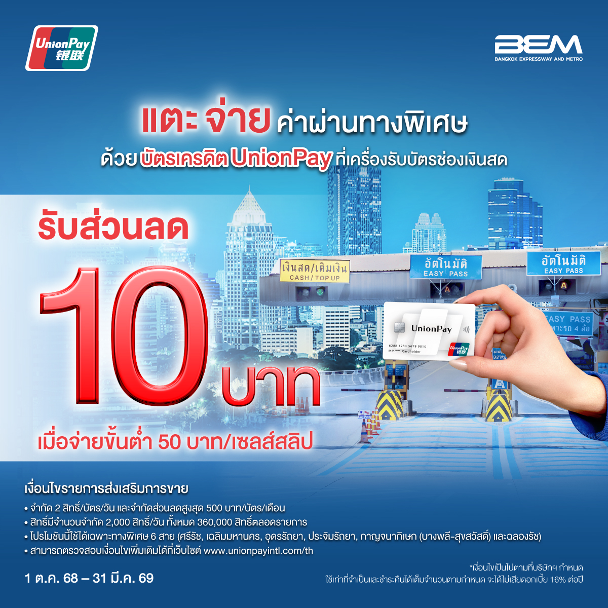 บัตร UnionPay แตะจ่ายค่าผ่านทางรับส่วนลด 10 บาท เมื่อจ่ายขั้นต่ำ 50 บาท ต่อรายการ ที่ทางพิเศษ 6 สาย